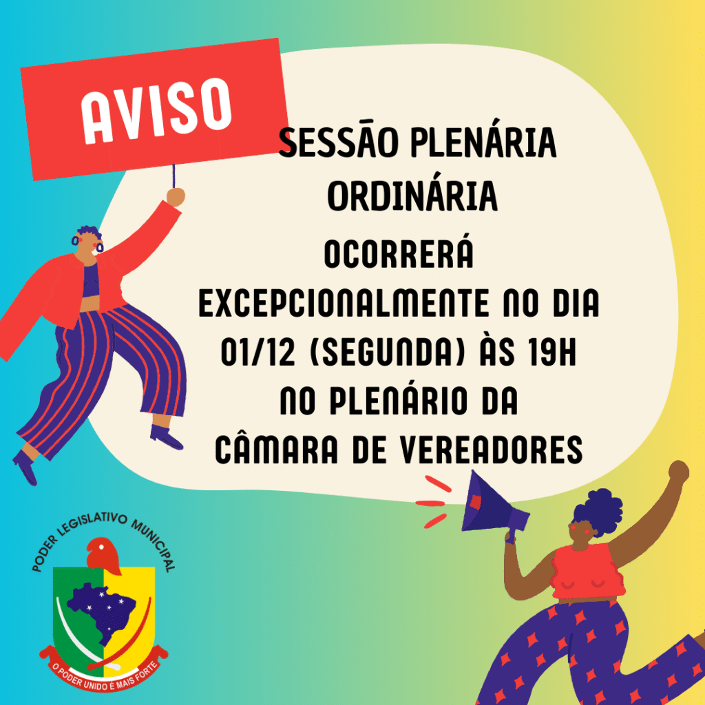 Excepcionalmente, a Sessão que iria ocorrer no dia 02 de dezembro, as 19h no Plenário da Câmara, foi antecipada para o dia 01 de dezembro no mesmo horário.