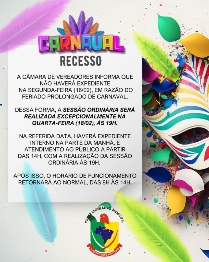 Do dia 16 de Janeiro à 15 de Fevereiro, a Câmara Municipal de Vereadores funcionará das 8h às 12h.