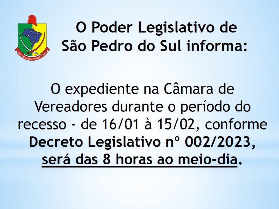 Durante o período do recesso parlamentar, que começa no dia 16 de janeiro e vai até o dia 15 de fevereiro, o funcionamento da Câmara de Vereadores será das 8 horas até o meio-dia, com atendimento normal ao público nas bancadas, setores administrativos e contábeis.