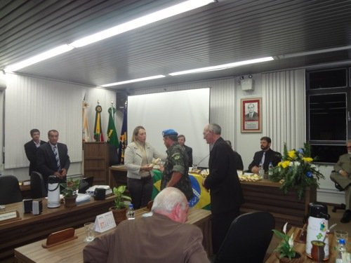 Na ocasião a Câmara foi ornamentada com as cores da nossa Bandeira Nacional e a Verª Angélica Felske Gabriel passou um filme sobre a participação dos mesmos no Haiti.