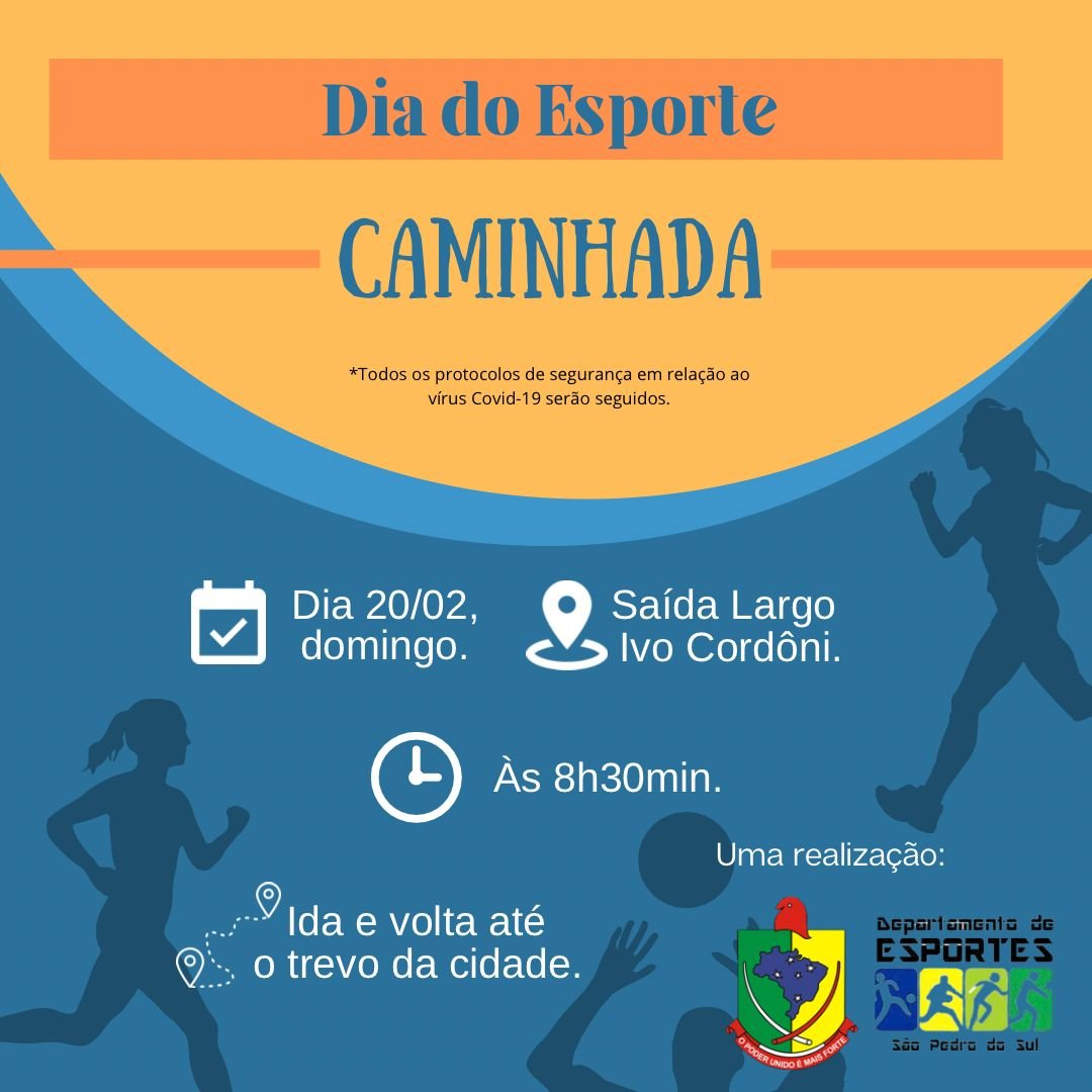 Em comemorações do Dia Nacional do Esporte no dia 20 de fevereiro (domingo),concentração se dará às 08h30min no Largo Ivo Cordoni com saída prevista para 08h45min.