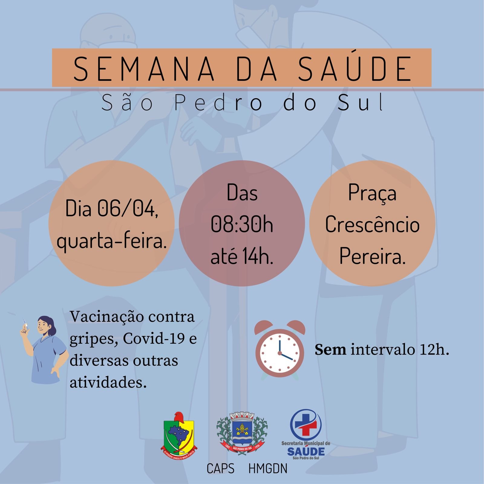 Seguindo o seu calendário de eventos e em alusão à Semana da Saúde, a Câmara de Vereadores e equipes da Secretaria Municipal de Saúde, do CAPS e do HMGDN, estarão promovendo uma intensa programação na Praça Crescêncio Pereira na próxima quarta-feira, dia 06 de Abril.