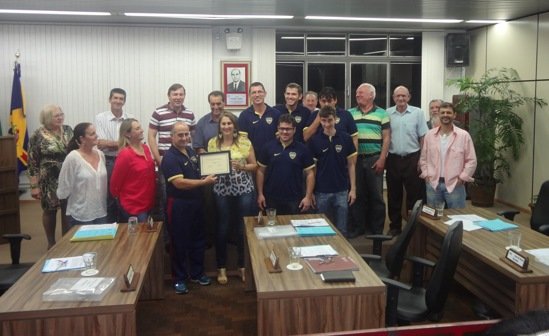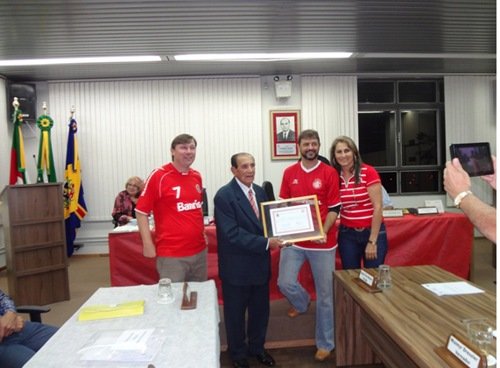 Aconteceu no dia 20 de abril do corrente ano na Sessão Ordinária uma Moção de Congratulações de autoria dos Verº Fábio Polenz Parnov (PMDB), Verº Cristiano Stein (PP) e Verª Ziania Maira Bolzan (PTB), ao Sr. JOÃO CRESCÊNCIO, atleta são-pedrense do Futebol Clube Internacional e mais antigo integrante do plantel do Rolo Compressor do Clube referenciado. Foram homenageados também, a esposa do mesmo Sr.ª HELE COMASSETTO CRESCÊNCIO, a qual recebeu uma buquê de flores da Presidente da Câmara Verª Ziania Maria Bolzan e um mimo a nora Sr.ª VERA SOUZA. O Verº Fábio Polenz Parnov entregou uma réplica da camiseta do Esporte Clube Internacional de 1940, confeccionada e pesquisada pelo torcedor Diego Ebling, ao Sr. WALMIR CRESCÊNCIO, filho do homenageado. Nesta ocasião o hall de entrada da Câmara de Vereadores foi enfeitada com folders, bola, bandeira, camisetas histórica do Esporte Clube Internacional e o Plenário ficou repleto de colorados que prestigiaram nosso homenageado. O seu JOÃO CRESCÊNCIO nasceu na localidade de Inhamandá, interior de São Pedro do Sul, no dia 25 de dezembro de 1918. Partiu cedo para Santa Maria, pois o pai era ferroviário. De lá, por volta de 1937 foi para Porto Alegre servir como Aluno no Centro de Instrução da Brigada Militar. Desenvolveu-se no esporte e passou a treinar nos Juniores do S.C. Internacional pegando carona para treinar no antigo estádio dos Eucaliptos. Ganhava apenas a camiseta, pois o restante do uniforme e as chuteiras eram por conta própria. Importante salientar que nesta época os jogadores ainda não recebiam salário. Promovido para o profissional ele atuou no Inter entre 1940 e 1942 num time conhecido como “Rolo Compressor”, que foi Hexacampeão Gaúcho entre 1940 e 1945 e considerado uma das melhores equipes da história do Clube. Era centroavante jogando ao lado do ponta-direita Rui Motorzinho e do ponta-esquerda Carlitos (craques da época). Ao mesmo tempo, seu JOÃO CRESCÊNCIO era jogador de Basquete sagrando-se Vice-Campeão brasileiro deste esporte pelo Inter. Nas três temporadas que jogou pelo Inter foi Tricampeão Gaúcho enfrentando equipes como Grêmios, Renner, força e Luz, São José, Cruzeiro, Novo Hamburgo, Caxias, Santa Cruz, etc. quando o Gauchão ainda era regionalizado. Em 1943 retornou para Santa Maria onde fundou e atuou por mais alguns anos como profissional no já extinto Guarani Atlântico onde foi Campeão santa-mariense profissional em 1962. Parou de jogar no início dos anos 70 virando dirigente de Futebol. JOÃO CRESCÊNCIO, morador de Santa Maria, foi homenageado em 2009 pelo Consulado local da cidade vizinha nos 100 anos do Clube; em abril de 2014 na reinauguração do estádio Beira-Rio; e em dezembro do ano que passou na inauguração da estátua do eterno capitão Fernandão recebeu o Diploma de atleta mais antigo integrante do plantel do Rolo Compressor.